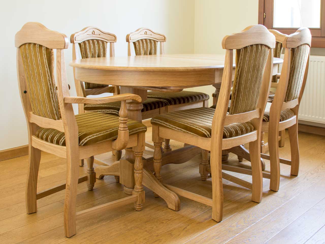 Naša rodinná jedálenská zostava je vyrobená výhradne z masívneho dreva – je vyrobená bez dyhovaných časti z najkvalitnejších domácich druhov drevín, ako divá čerešňa alebo dub.